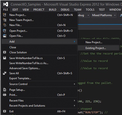 Open the plugins project in Microsoft Visual Studio, click on FILE > Add > Existing Project…