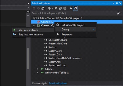 On the Solution Explorer right click on Connect I/O and then on Debug > Start new instance