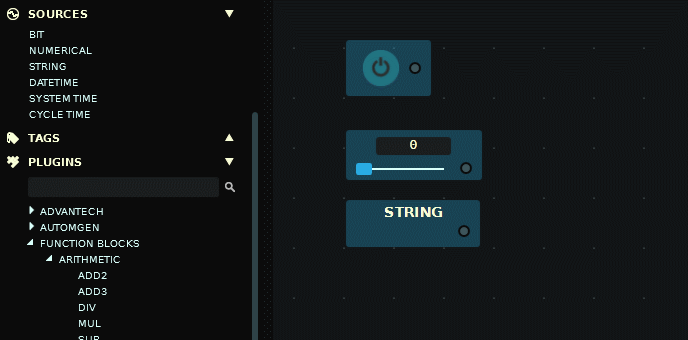 After placing and arranging nodes, you create links between them by clicking on a node's output socket and dragging it to the target input socket. Note that you can only create links between compatible data types, for example, you cannot link a Boolean value to a node's socket which expects a number (byte, short, int, long, float or double). Although, when a node's input socket expects a numerical value it will accept any data type and will automatically convert it.