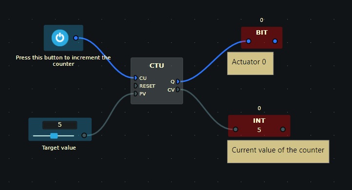 Now that the diagram is done Left-click on the Bit input (button) to increment the counter. When it reaches 5 (the preset value), it will set the output Bit to true.