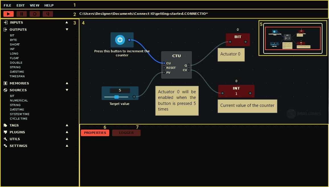 To understand the basic operation of Connect I/O we are going to create the diagram presented in the image displayed at the top of this page. This diagram has a simple purpose: set an output to true when a counter reaches the target value of 5.
