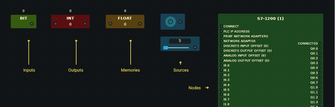 - Nodes: nodes that provide some kind of functionality (e.g. connection with a Siemens PLC through Ethernet or simply a node that multiplies two numbers).