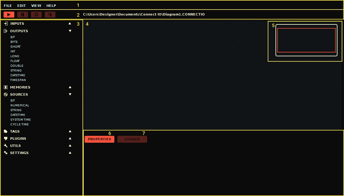 This page is intended to give you an overview of the user interface elements. All parts of Connect I/O are visible by default, providing you with a simple user interface to get acquainted and work with.