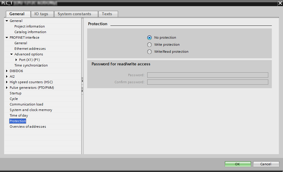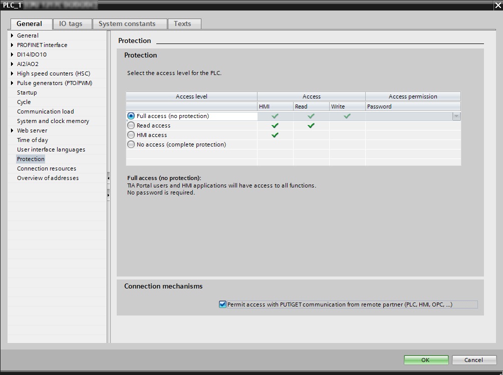 Pour permettre l'interface entre Connect I/O et un PLC Siemens, vérifiez les paramètres de protection du PLC dans la configuration matérielle de TIA-PORTAL.