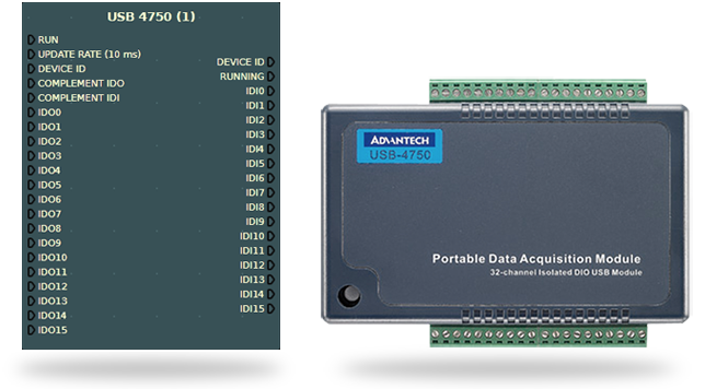 Ce nœud fournit la connectivité avec les cartes Advantech USB 4750 DAQ. Il est couramment utilisé pour le câblage PLC ou tout autre matériel nécessitant des E/S numériques opto‑isolées.