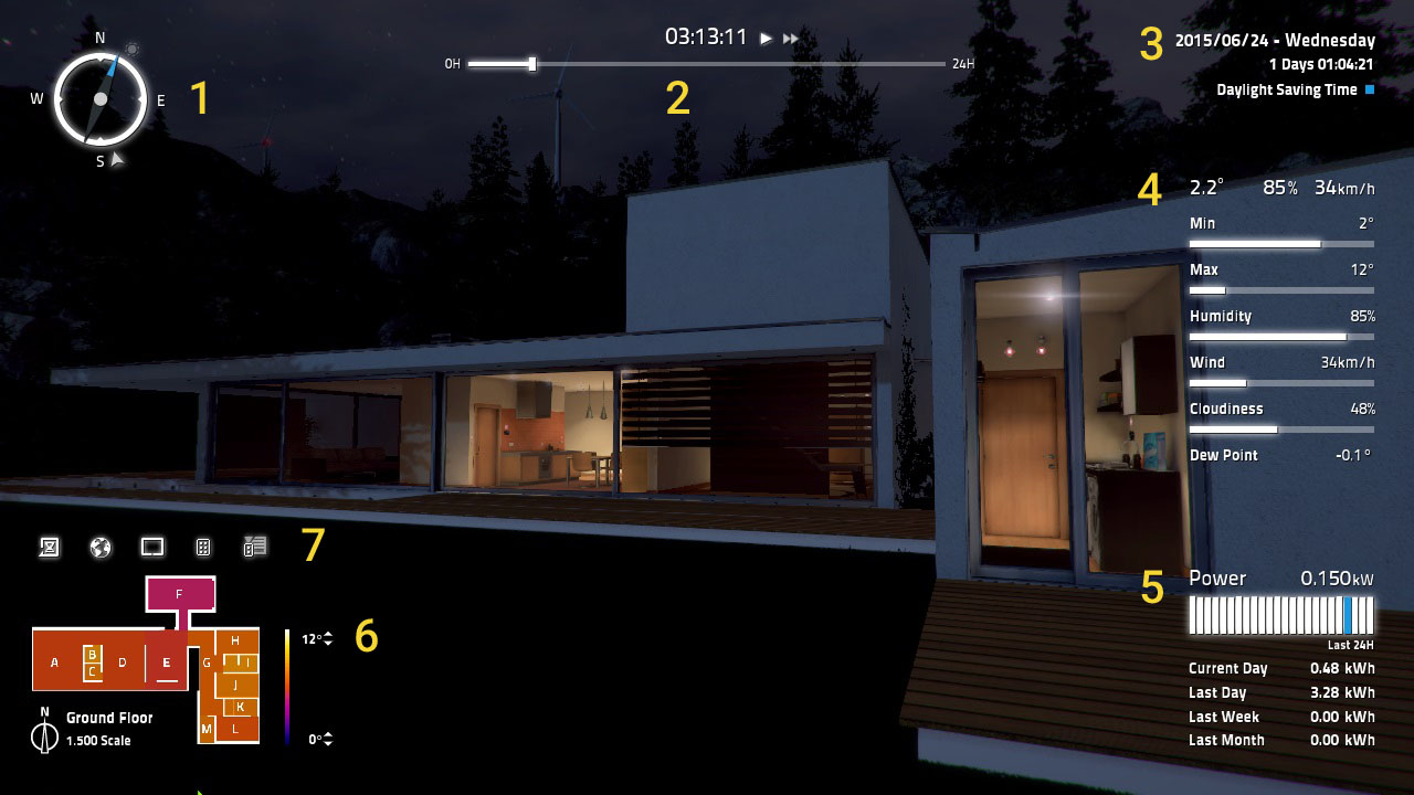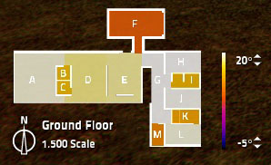 The Minimap is used to identify the different rooms, the character’s position and orientation and for fast navigation between rooms. Each room color indicates its temperature based on the thermal color scale shown on right side of the minimap.