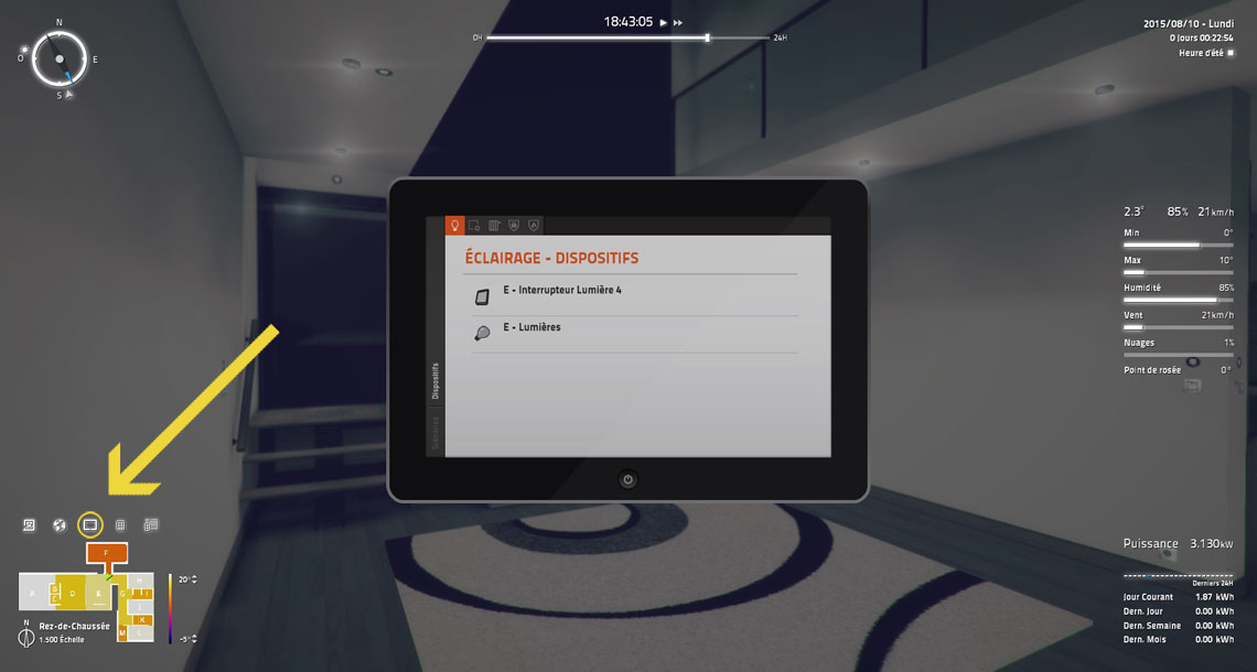 La console domotique vous permet de créer des scénarios simples, où les conditions et les actions sont programmées. Les scénarios et les dispositifs sont regroupés dans cinq catégories différentes : Éclairage, Motorisation, Chauffage, Sécurité Intrusion et Sécurité Domestique, organisées sur l’onglet en haut. Pour chaque catégorie, une liste de scénarios correspondants et dispositifs compatibles peut être sélectionnée par l’onglet à gauche.