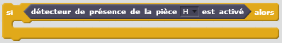 Dans notre cas, la condition du mouvement dans la pièce est traduite par le bloc « Détecteur de présence de la pièce A ». Ce bloc est modulable et permet de choisir dans quelle pièce on souhaite détecter le mouvement. Dans notre cas, il y a juste à modifier la pièce A et la remplacer par H.