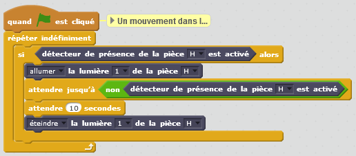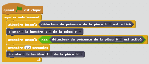Il faut donc ajouter dans ce bloc d’attente un bloc « non » de la catégorie « Opérateurs » dans lequel on ajoute le bloc détectant la lumière dans la pièce H.