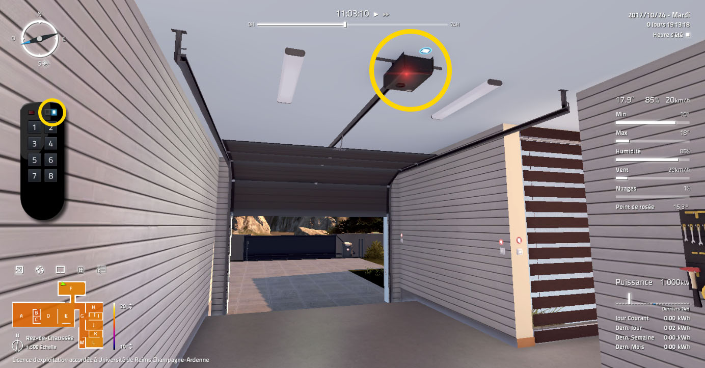 Un appui sur le bouton 1 de la télécommande ouvre la porte du garage, après une temporisation de 5 secondes en position ouverte, la porte se referme. Lors de la fermeture, lorsque la porte n’est plus ouverte, si on appuie une nouvelle fois sur le bouton 1 ou, si le détecteur infrarouge présent au niveau de la porte du garage détecte un passage, la porte s’ouvre à nouveau. Ce cycle est répété tant que la porte du garage n’est pas fermée.