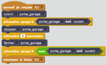 Si la condition « NON porte fermée ET (bouton télécommande 1 OU capteur infrarouge », est vérifiée la porte doit s’ouvrir. Il faut donc envoyer le message « X2 » ce qui permettra au programme de boucler vers le script qui permet d’ouvrir la porte. Dans le cas contraire, cela signifie que la porte est fermée, on doit donc stopper la porte de garage et par l’envoi du message « X1 » retourner vers le script qui attend que le bouton 1 soit appuyé.