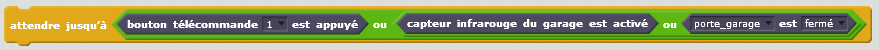 Dans ce script, dès la réception du message « X3 », il faut vérifier qu’au moins une des conditions de la divergence en OU est présente : « bouton télécommande 1 » OU « capteur infrarouge du garage » OU « porte du garage fermée ». Pour cela, on utilise un bloc « attendre jusqu’à » dans lequel on ajoute les l’état des capteurs correspondants.