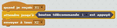On sélectionne donc le bloc « Quand – drapeau vert – est cliqué » dans la catégorie « Evènements » et le bloc « envoyer à tous X1 » (X1 étant un nouveau message créé à partir du menu déroulant du bloc de la catégorie « Evènement »).