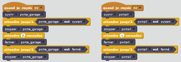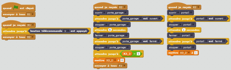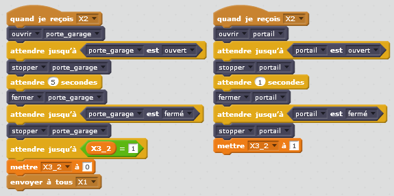 Après avoir reçu le message « X2 », il faut simultanément exécuter les actions concernant la porte et le portail telles qu’elles sont décrites dans le cahier des charges (respectivement étapes 1 à 6 et 11 à 16). Pour cela, on crée deux scripts distincts dans lesquels on exécute linéairement les actions suivantes :