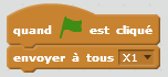 On sélectionne donc le bloc « Quand – drapeau vert – est cliqué » dans la catégorie « Evènements » et le bloc « envoyer à tous X1 » (X1 étant un nouveau message créé à partir du menu déroulant du bloc de la catégorie « Evènement »).