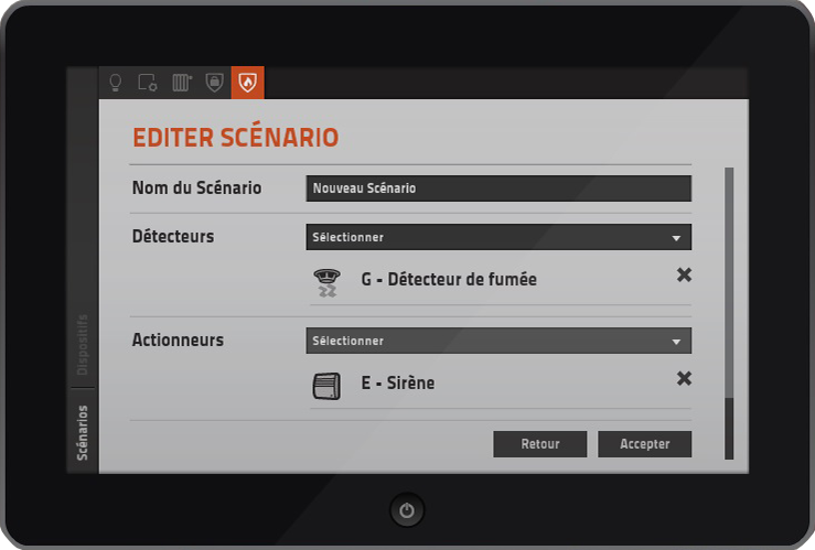 Un scénario est créé si et seulement si au moins un détecteur de fumée et une alarme ont été définis.