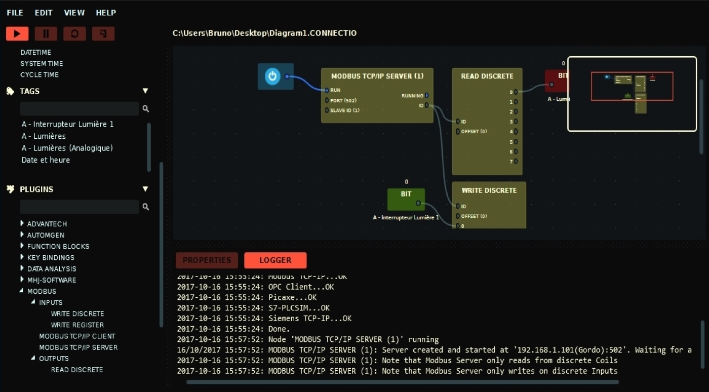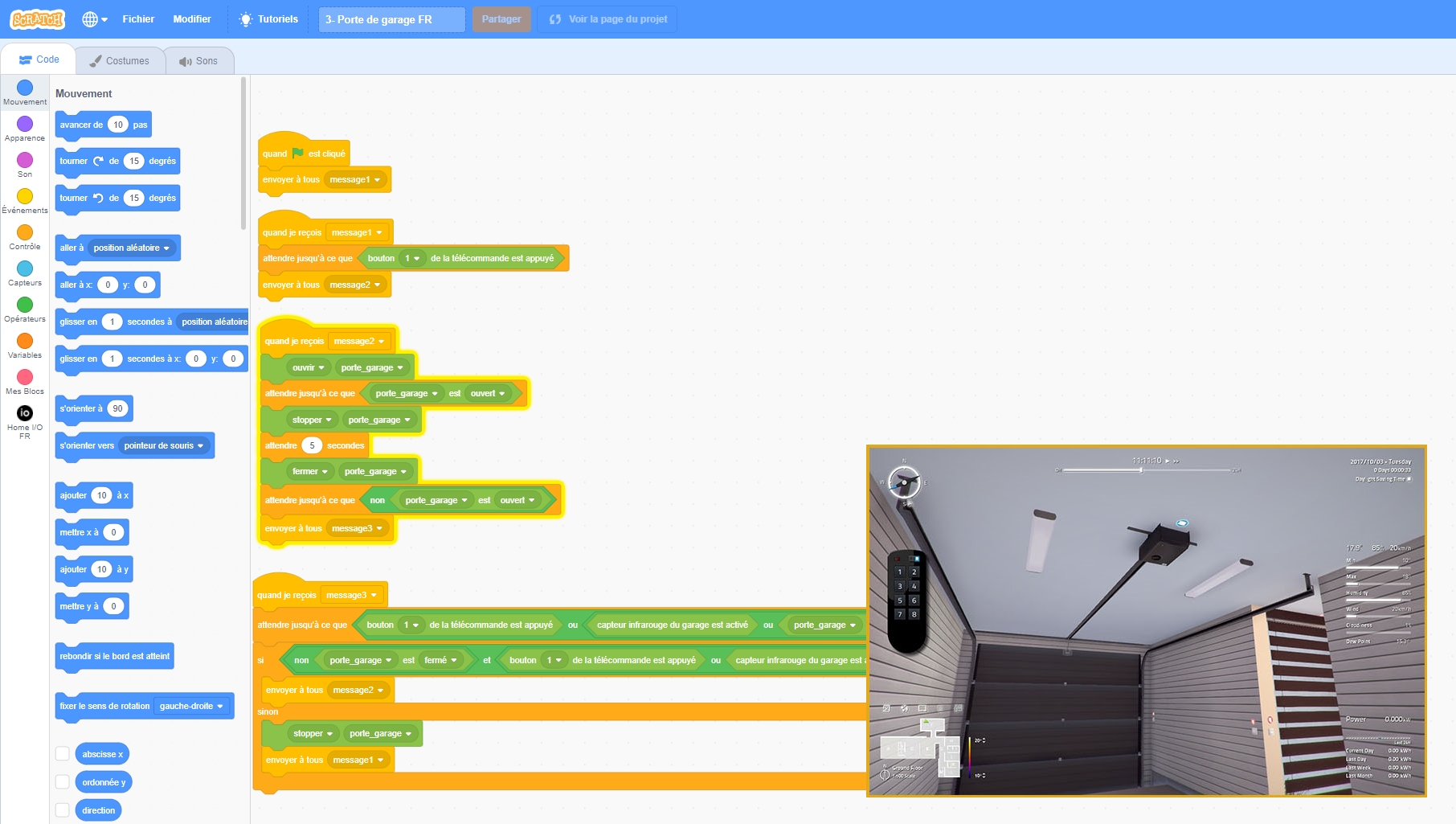 Une connexion directe et transparente pour l’utilisateur permet, à partir de blocs prédéfinis fournis, de créer des programmes avec Scratch, pour piloter la maison virtuelle.